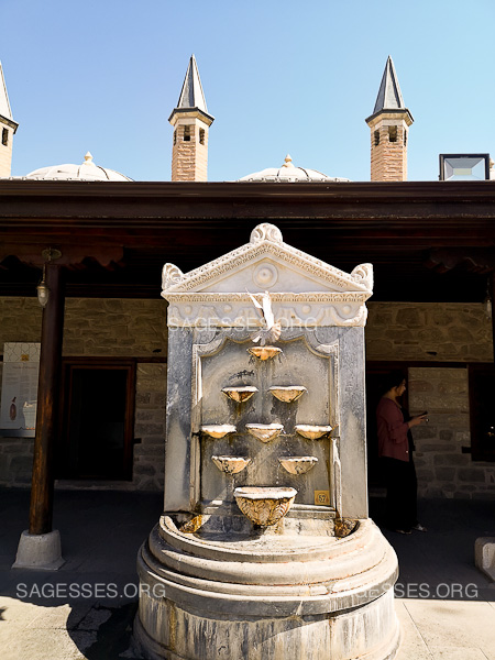 Le tombeau de Rûmî est aussi un musée et il y a des gardiens afin de respecter les horaires et la sécurité. Durant les quatre jours passés à Konya en 2019, je suis venue plusieurs fois par jour au sanctuaire afin de m’imprégner de l’esprit des lieux. C’était l’été et il y avait beaucoup de monde qui défilait. Comme je suis venue à plusieurs reprises durant plusieurs jours, un gardien me reconnaît, il me sourit avec bienveillance. Délicatement il m’offre un chapelet bleu ciel !
